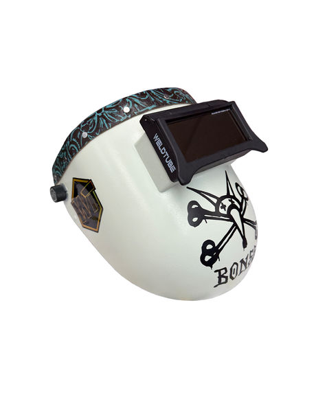 READY TO SHIP - Chopped Teal Black Floral Leather Top PIPELINER Welding Helmet, SLIM CUT
